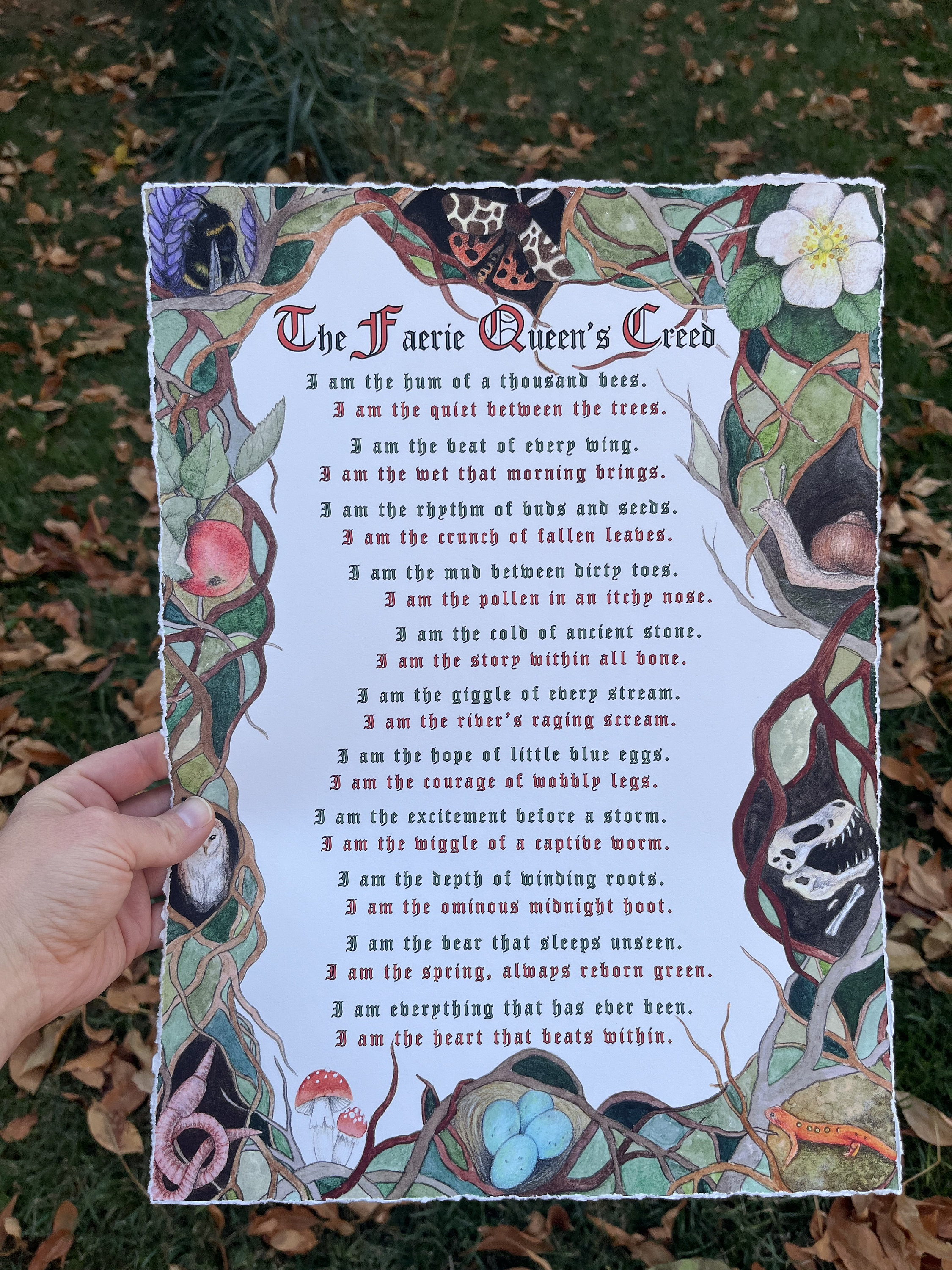 It was whimsical and magical, and I stared at and contemplated it my whole childhood. When I started writing for kids, it was a powerful influence, so I decided it would be cool to make some art prints of my own poems and spells to adorn the walls with. I have always made a habit of printing and hanging prayers or spells that I want to hold close in my daily life, because it helps me stay mindful and wonder-driven. It keeps the magic alive in the space it occupies all the time, not just when we sit down to do formal practices and finally open a text.