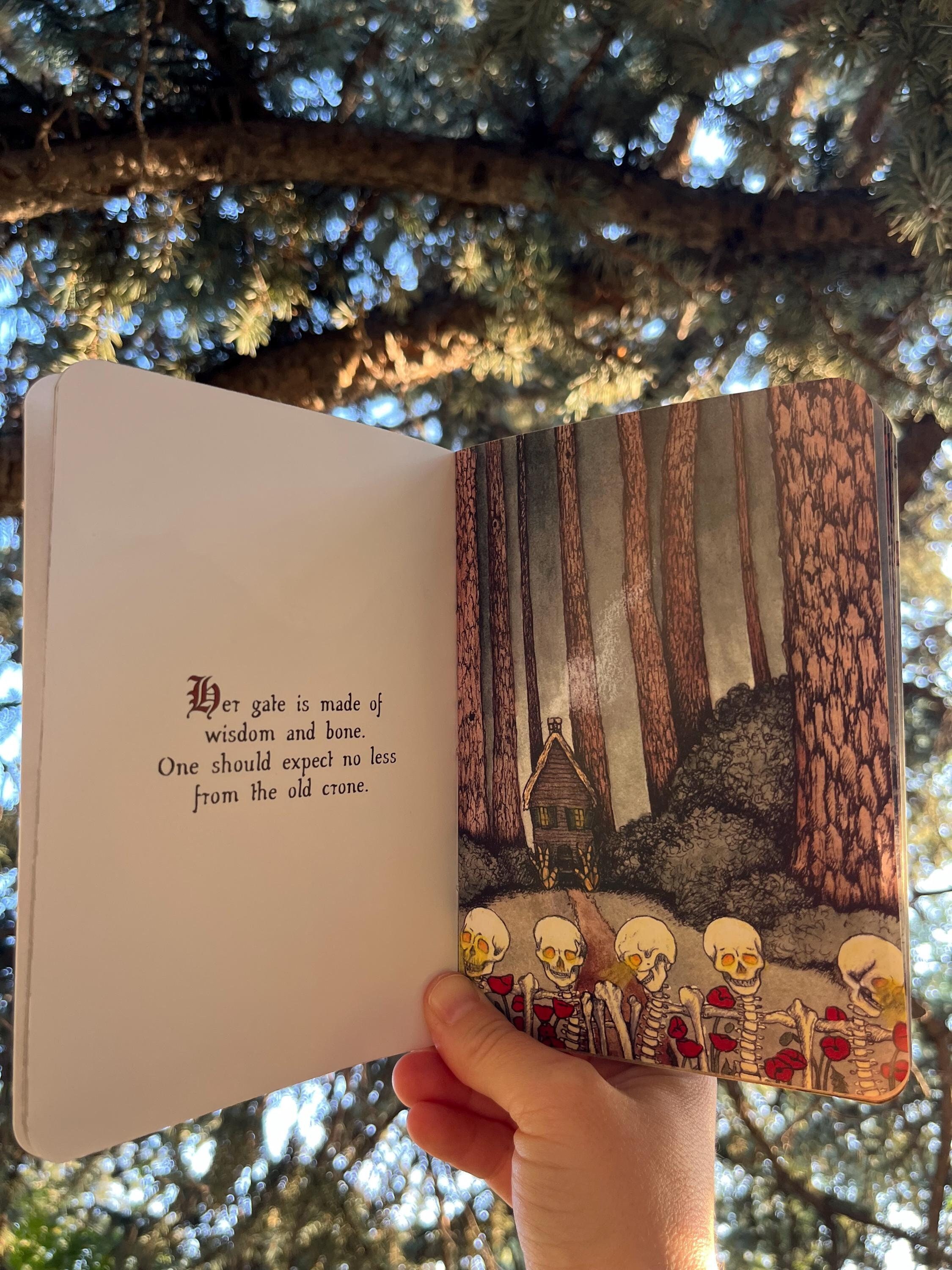 All of the illustrations in this book feature little snippets of Slavic Baba Yaga tales, such as the comb that becomes a forest, her geese, her "children," her chicken-footed house, her golden apples, and of course, her classic skeleton garden gate.