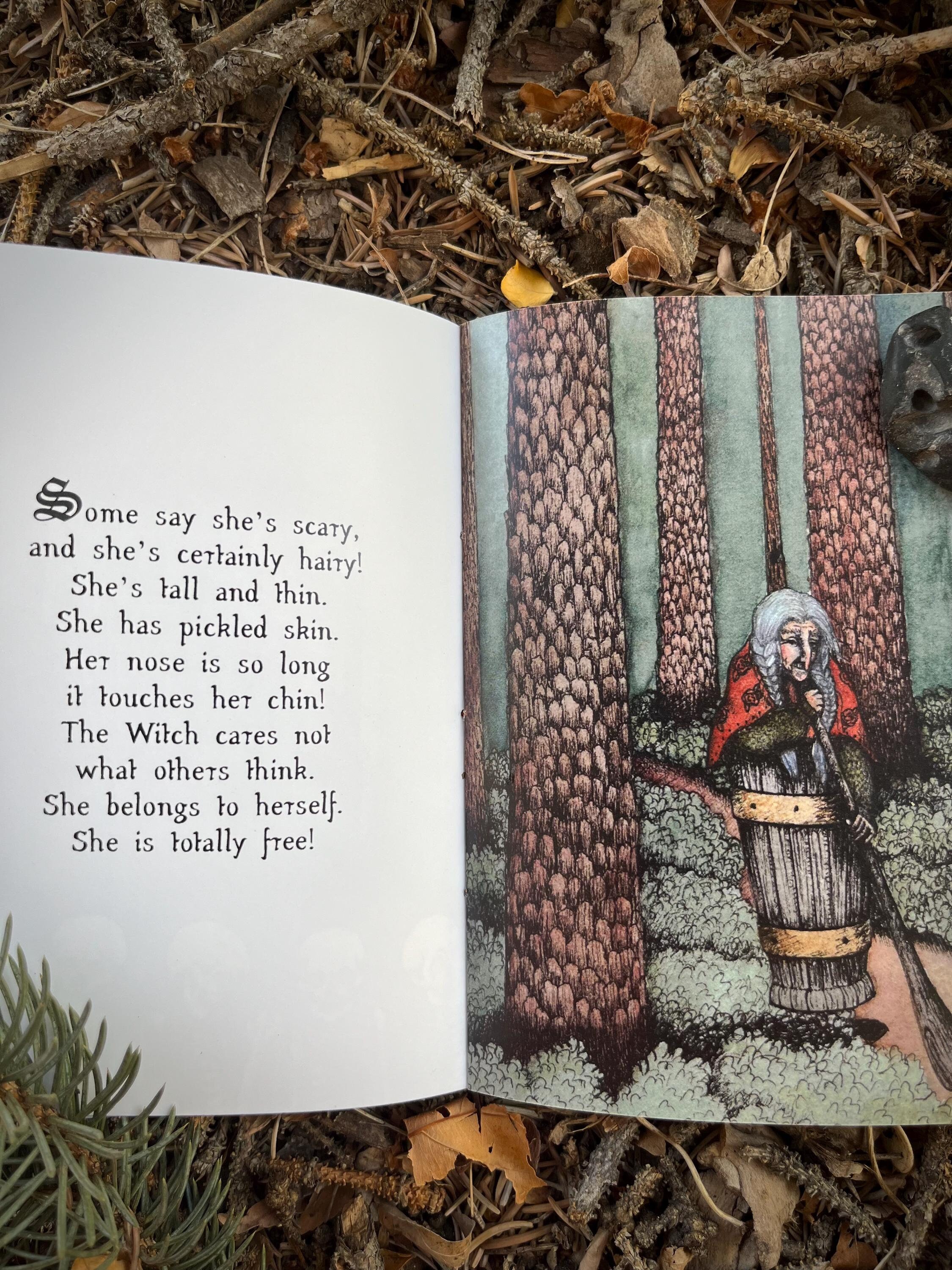 So at my house, we read her stories, and the stories of many other hags, and we discuss them. I want my kids to strive for sovereignty rather than obedience, and to listen to nature and the nature that speaks through them when something doesn't feel right, and when it does. To erase her, would not be a kindness to anyone except the demons of late-stage capitalism that would have us believe a woman is only as good and valuable as she is meek and youthfully attractive. So let's not.... Let's go meet her, the Witch of the Wood. She's calling her children back to the wood.
