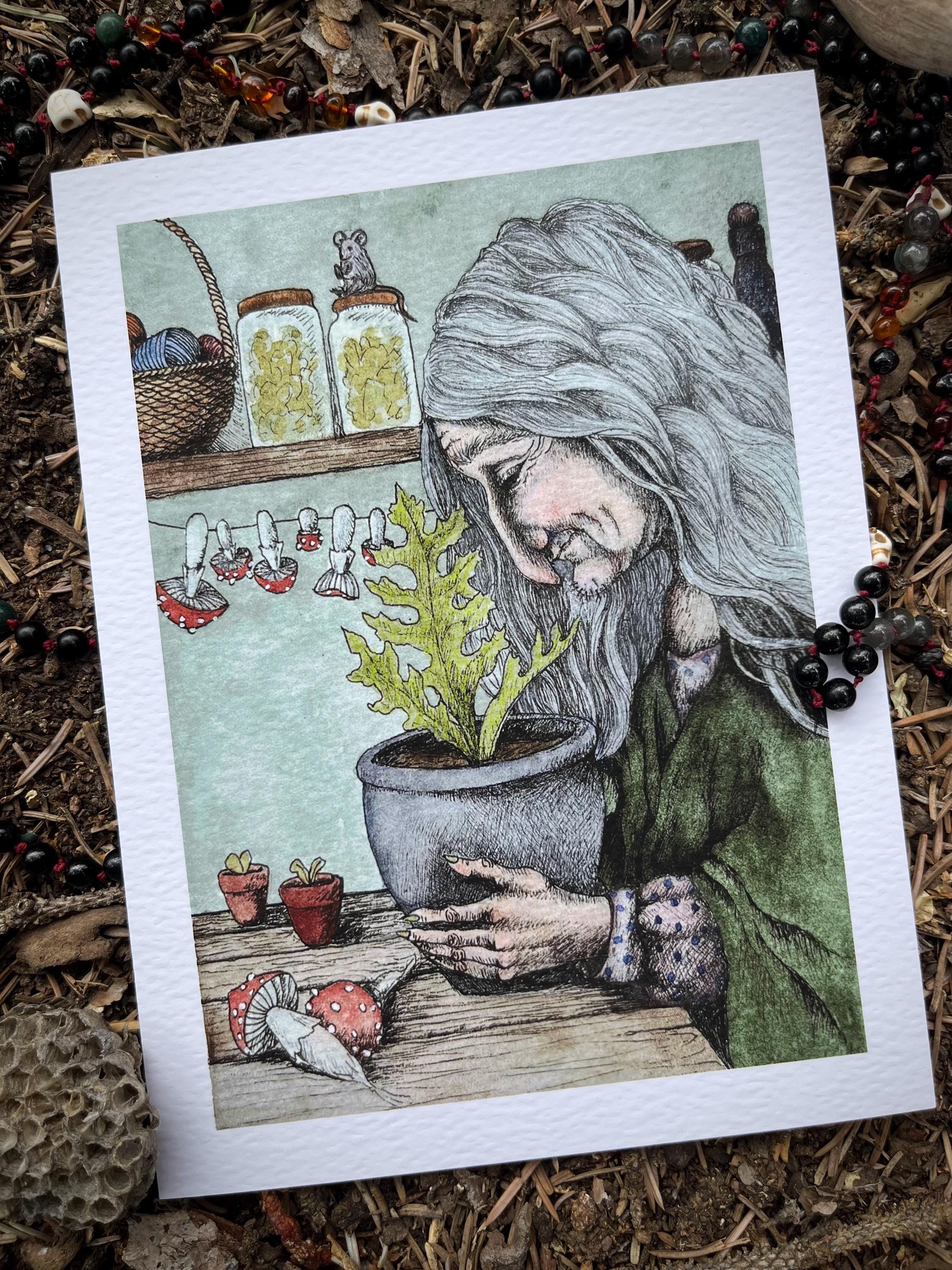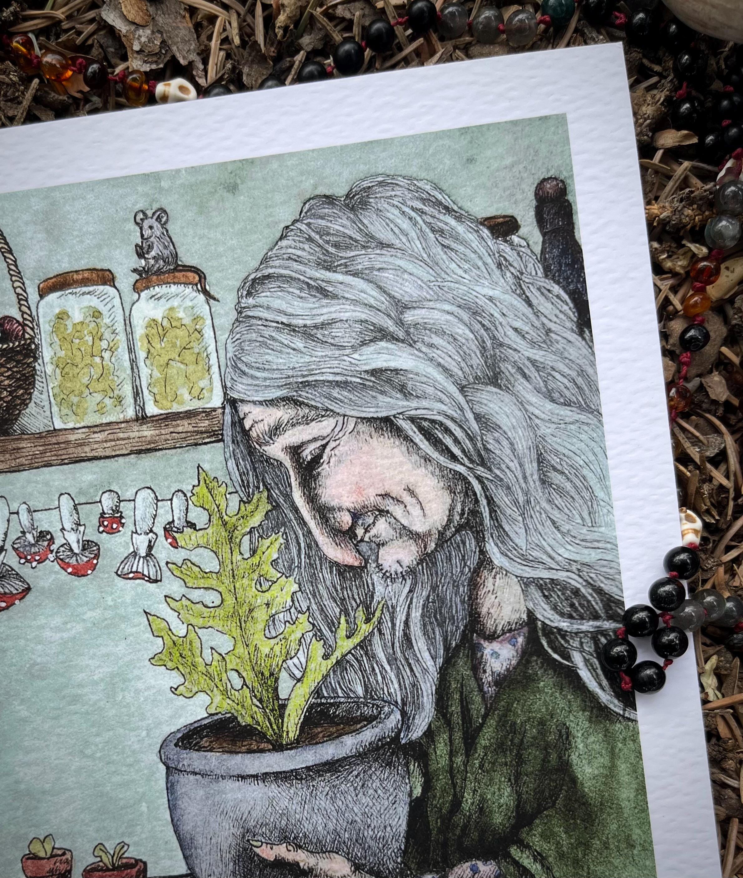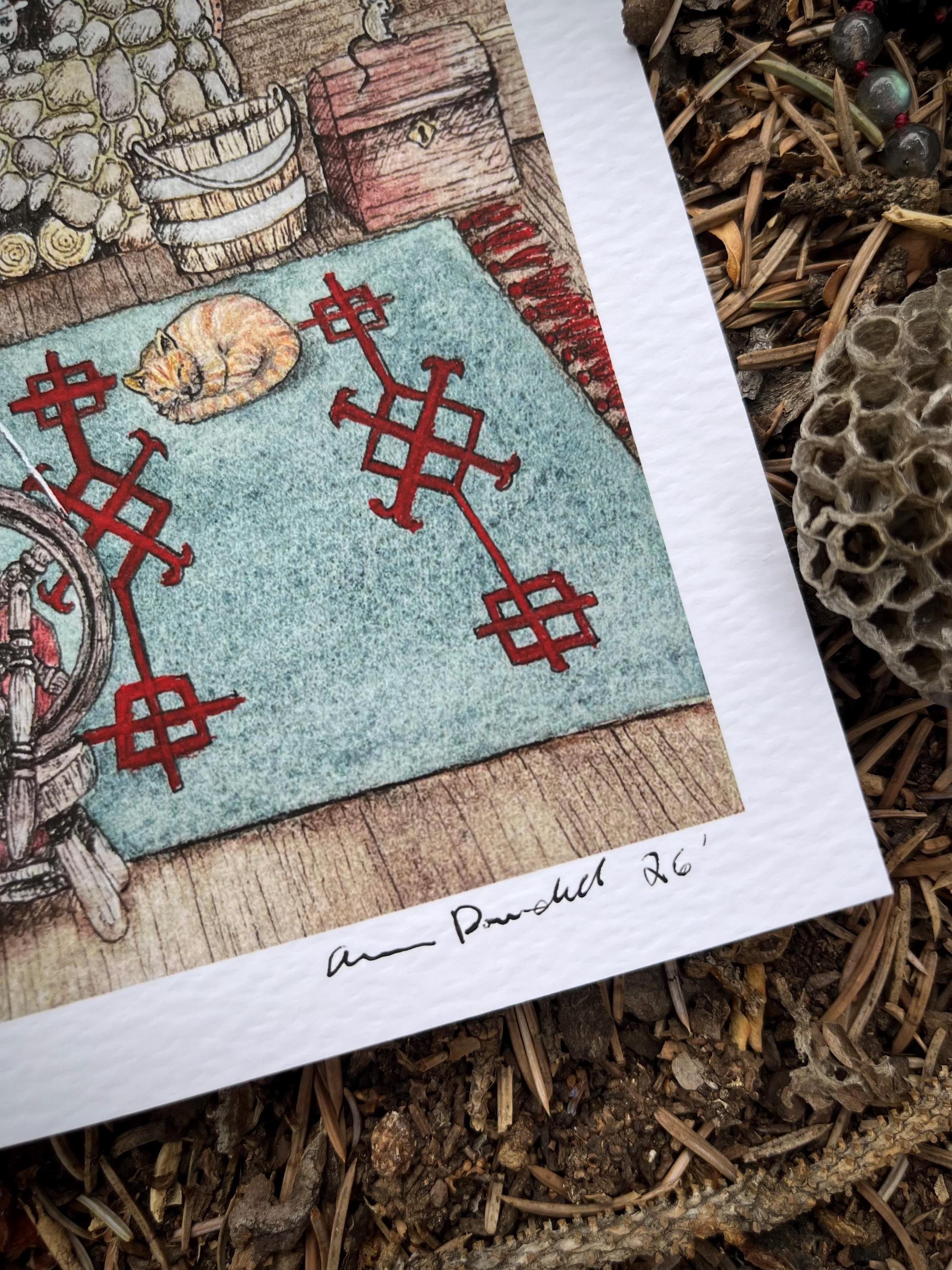 This listing is for one signed and numbered giclee print (on white archival studio watercolor paper) of my original watercolor illustration: “Baba Yaga 1.” The image itself is 5x7 inches with a half inch border around it.