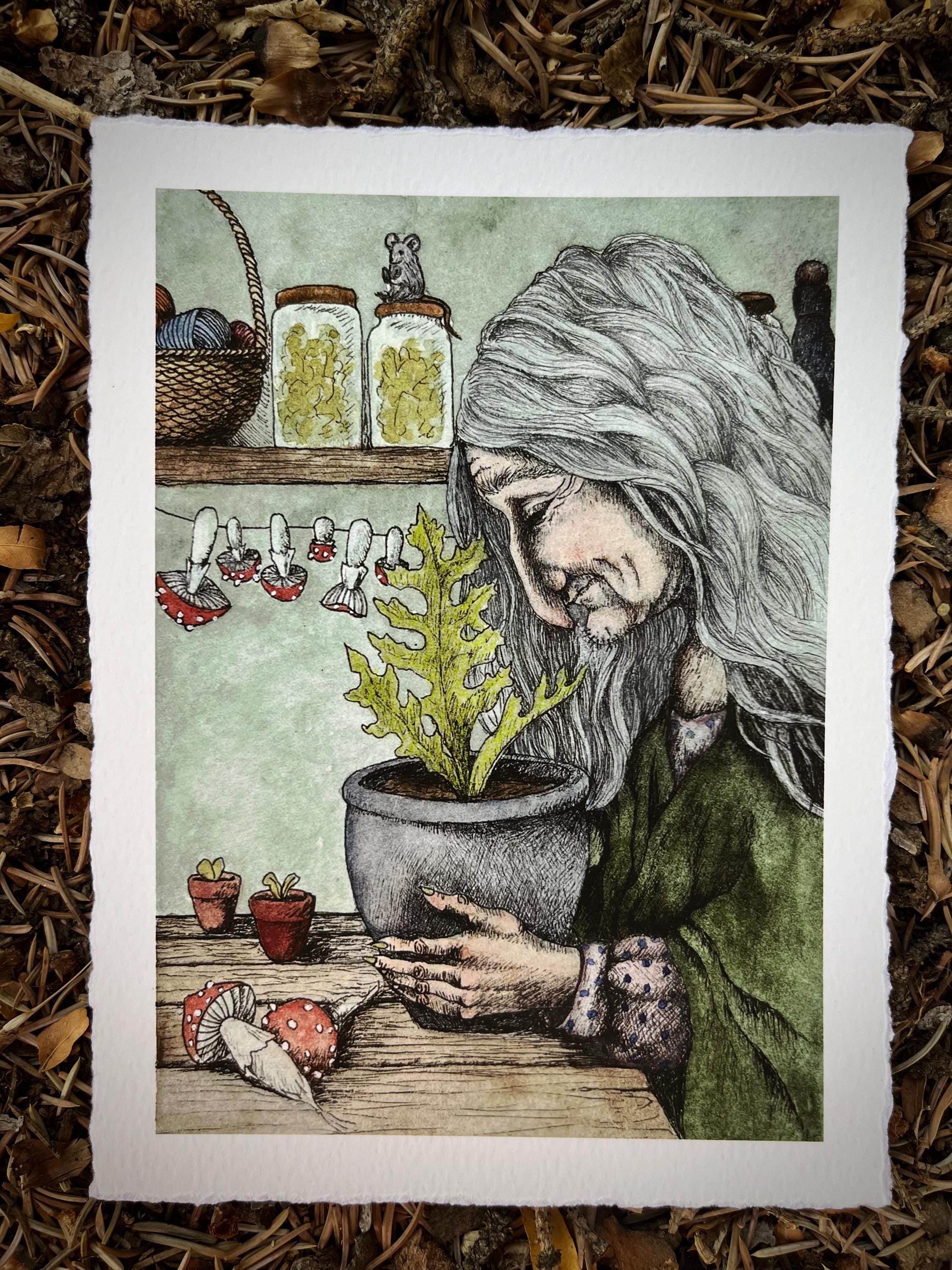 This listing is for one giclee print (on white archival studio watercolor paper) of my original watercolor illustration: “Baba Yaga 1.” The image itself is 5x7 inches with a half inch border around it. You have the option to add a hand-torn rough deckled edge as pictured in this listing, or have a straight edge (not pictured). The printer charges $2 for the deckled edge service. Each print is custom printed and shipped to you by Giclee Today, a professional fine art printer that I work with. It takes about two weeks for it to arrive via standard shipping, or one week if you choose rush. They do an amazing job and pack their prints with loving care. It’s minimal packaging, yet fully protective of the print which I appreciate. I recycle the materials into various art projects like flower pressing.