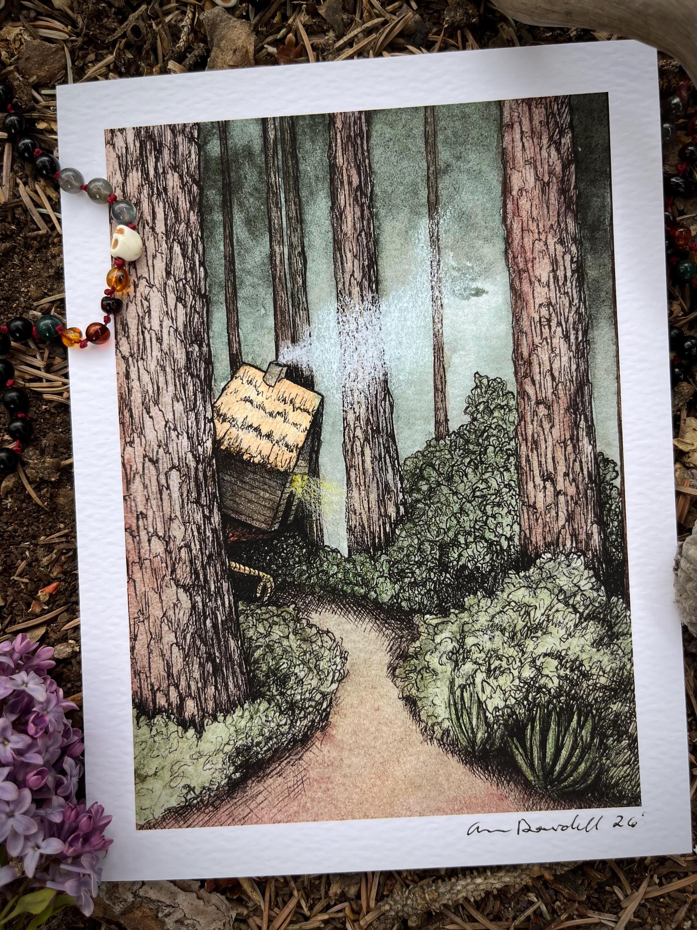 This listing is for one signed and numbered giclee print (on white archival studio watercolor paper) of my original watercolor illustration: “Baba Yaga 3.” The image itself is 5x7 inches with a half inch border around it.